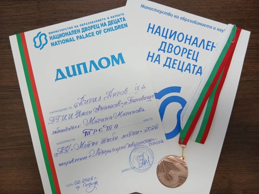 Кирил Киров от 9. клас, специалност „Икономическа информатика“, заслужи това признание, след като неговата литературна творба бе отличена с ТРЕТА награда и медал в престижния национален конкурс „Моите детски мечти“.