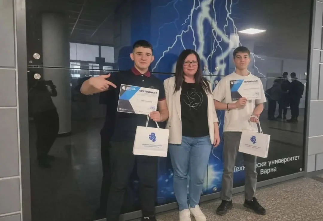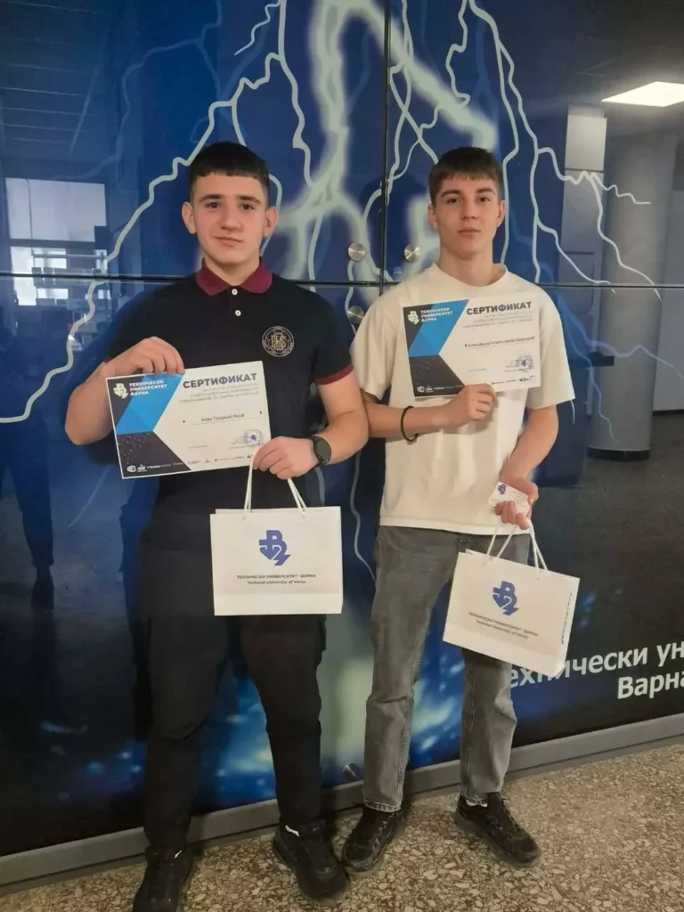 С гордост споделяме, че Александър Георгиев и Берк Исуф от 8.б клас, специалност „Програмиране на изкуствен интелект“, взеха участие във финалния етап на Националната университетска олимпиада по програмиране към Технически университет – Варна, проведен на 05.04.2026 г., и се завърнаха със сертификати за отлично представяне.